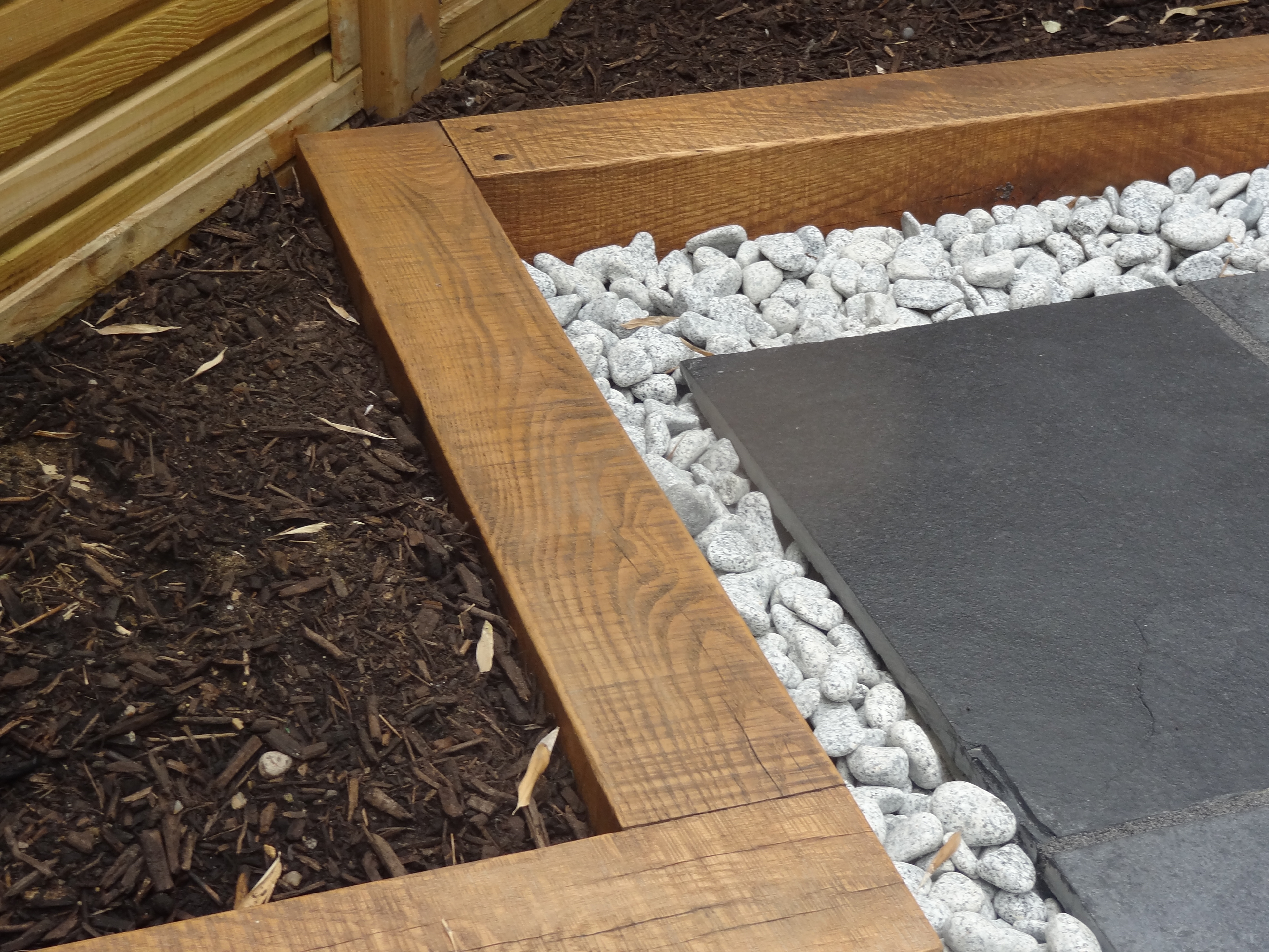 The borders are further defined by sanded and oiled oak sleepers and contemporary fencing.