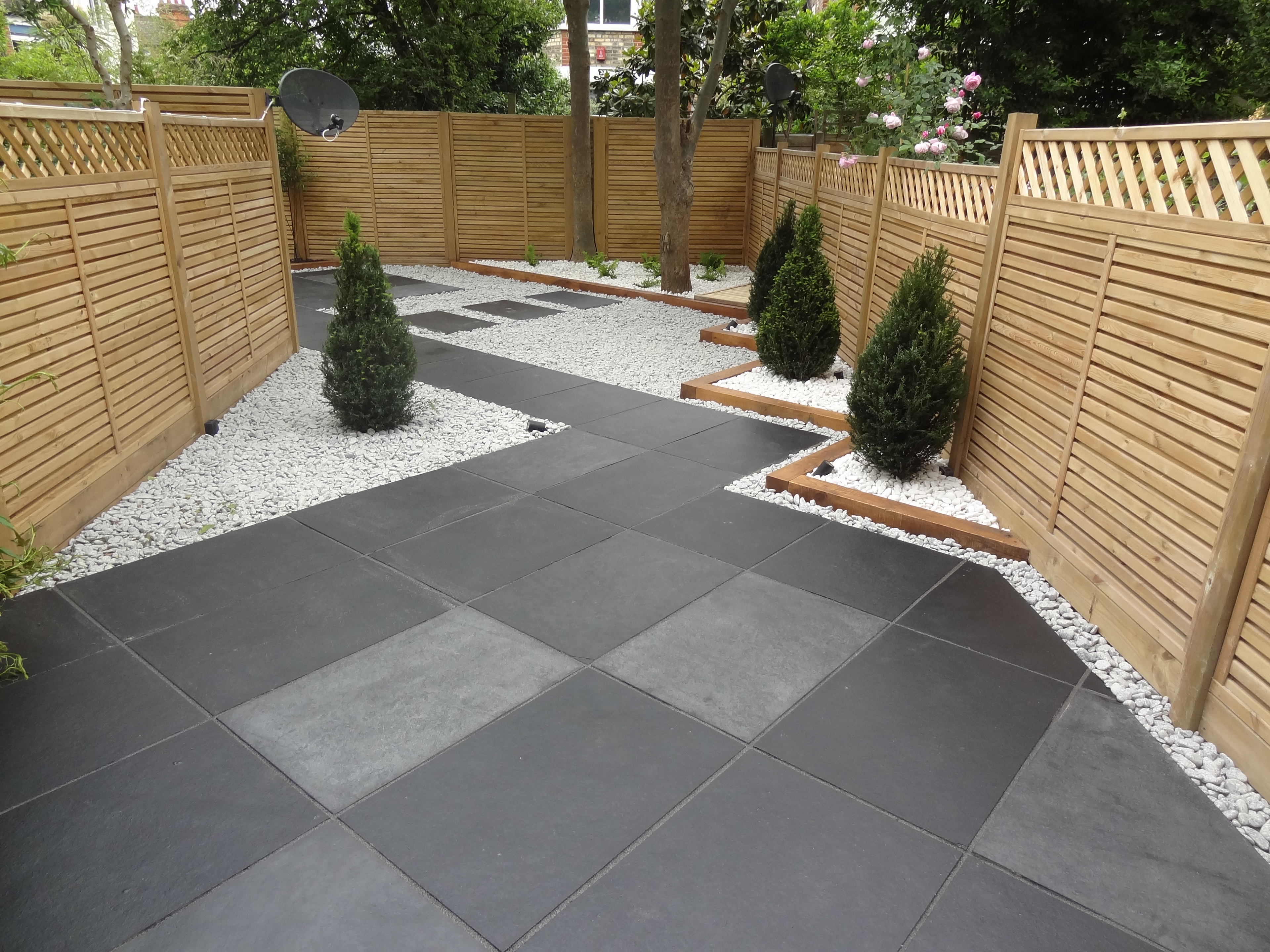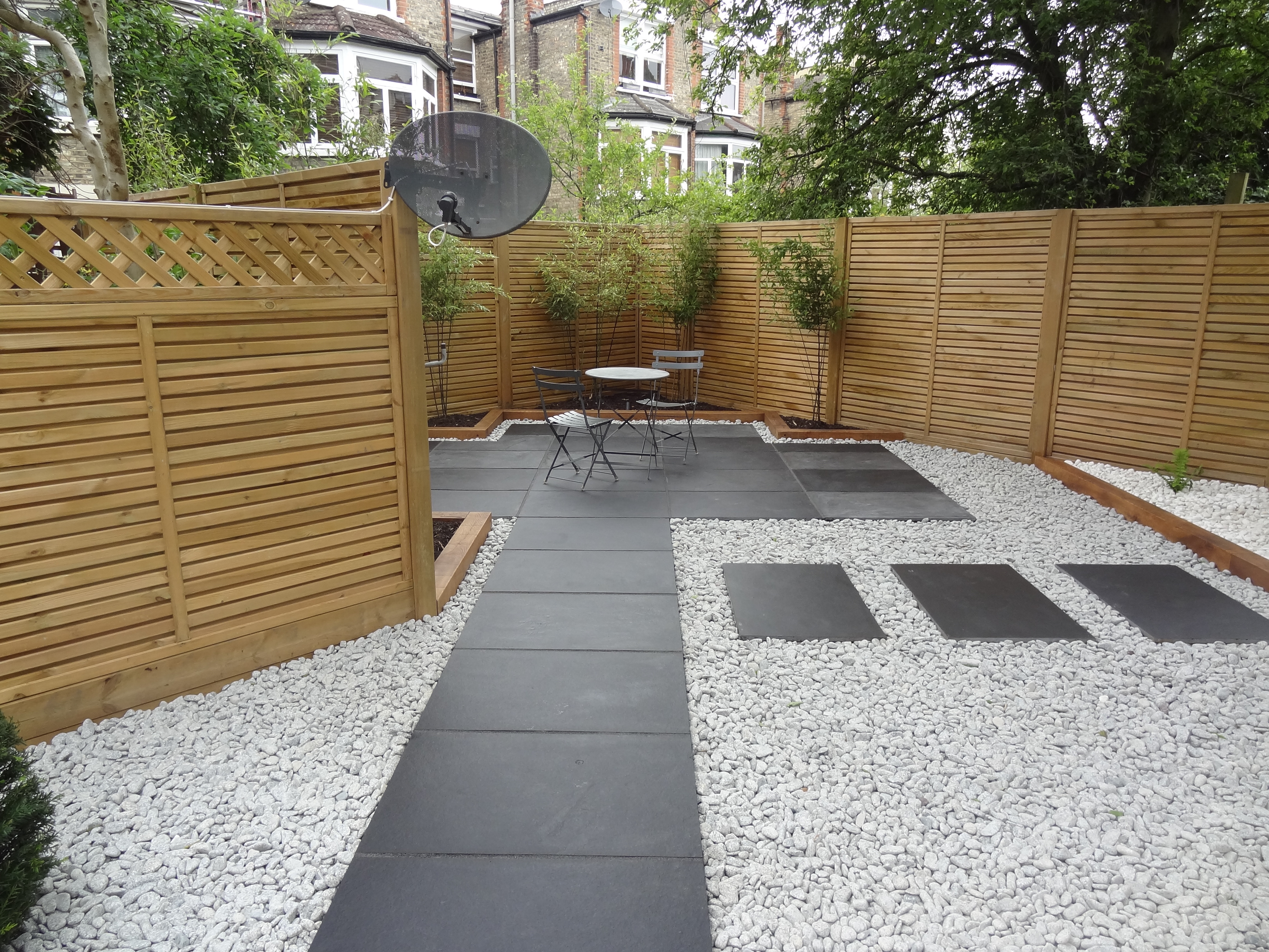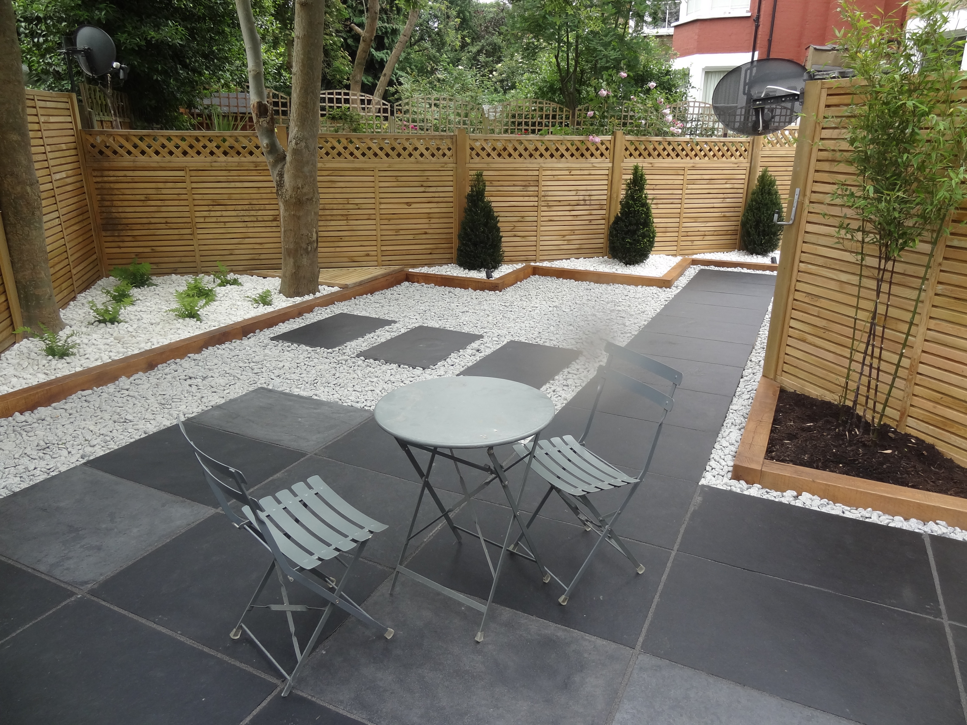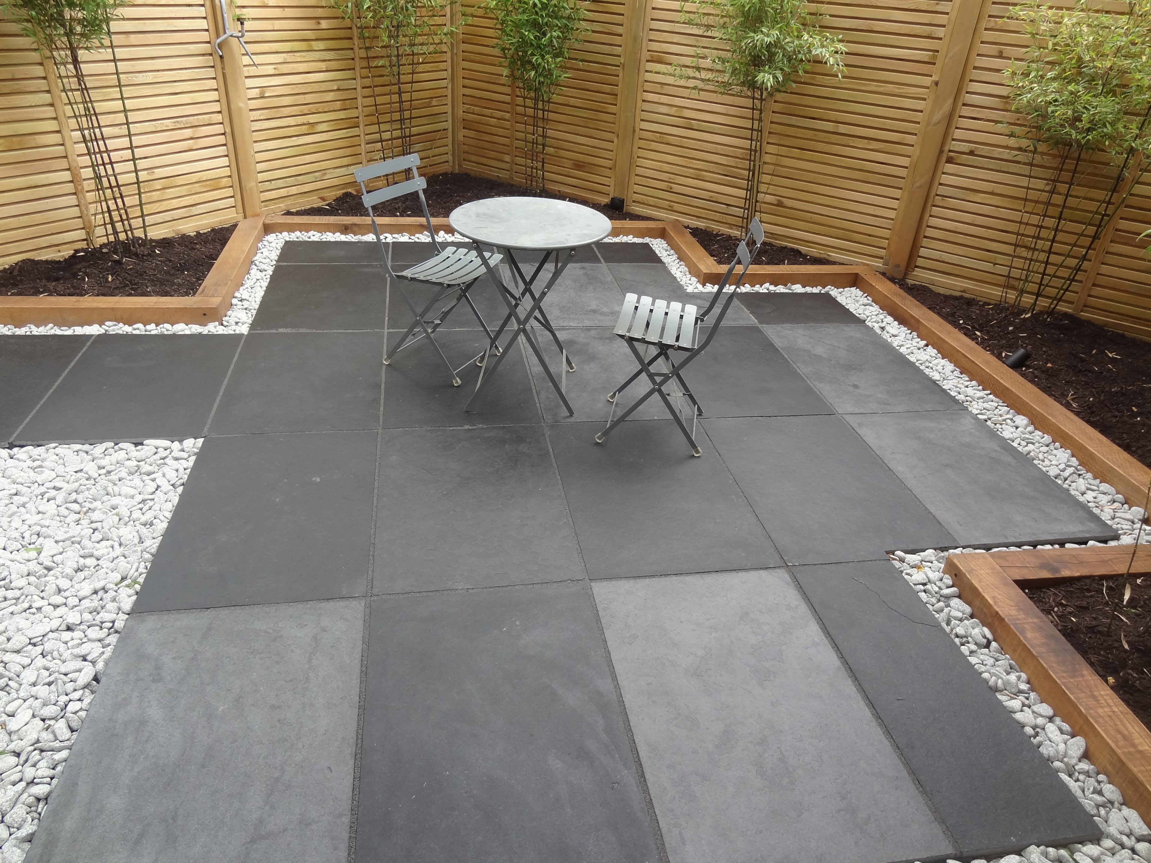 Phyllostachys nigra (black bamboo) pruned to display the stems and yew topiary cones are set in a mulch of Spanish white decorative pebbles. Paving in black Brazilian slate edged with silver grey granite cobbles add beautiful tonal contrast against the white pebbles.